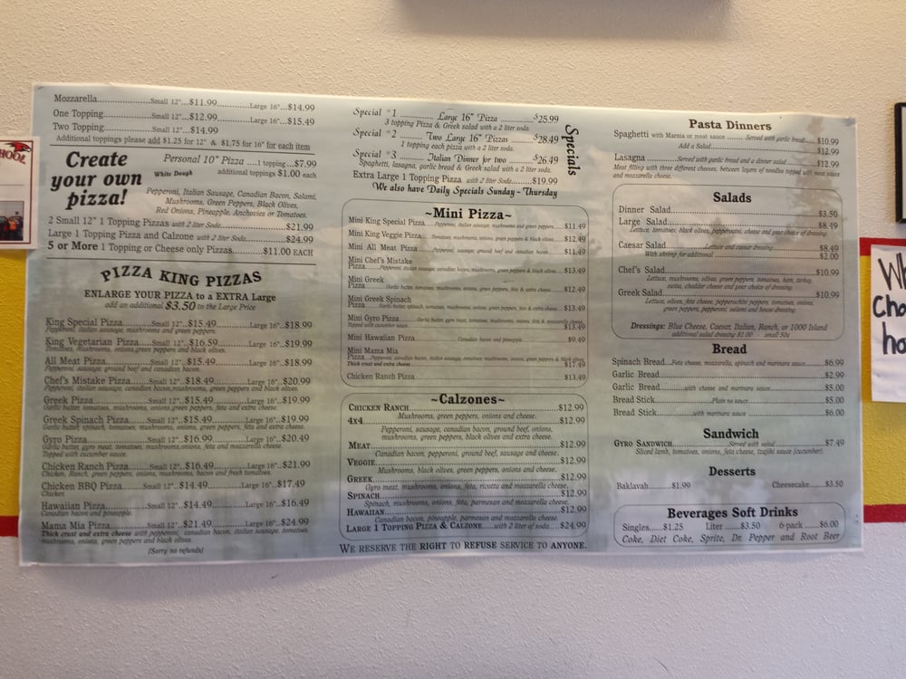 Introducing "Pizza King", a beloved eatery in Wasilla, AK specializing in pizza, sandwiches, and salads. This local gem offers a range of amenities such as delivery, takeout, reservations, and accessible parking. The menu boasts hand-tossed crusts and fresh ingredients, with standout deals like the large 3-topping pizza combo and hearty Greek salads. Customers rave about the friendly service and non-greasy, flavorful pizzas. The establishment, likely run by a Greek family, caters to all tastes with customizable toppings and a variety of dressings. With a bustling atmosphere and consistently delicious offerings, "Pizza King" is a must-visit for pizza lovers and those seeking a taste of the valley's best.
